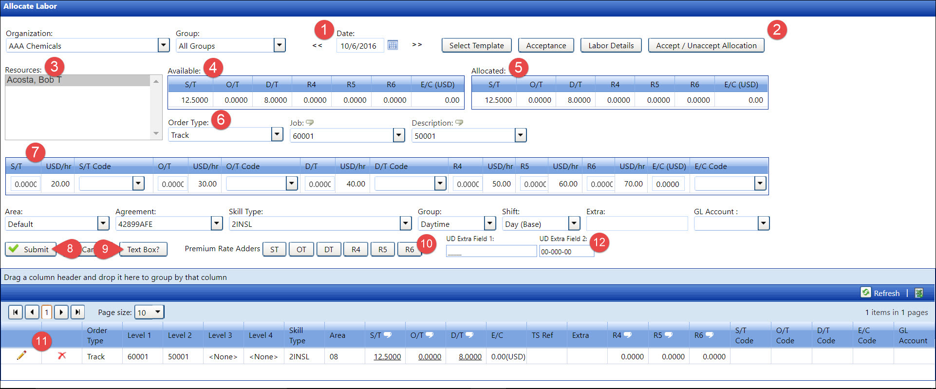 From the grid, click the Edit icon on a line item to display the work order information and to enable the S/T, O/T, D/T, E/C, R4, R5, and R6 text boxes. The Area, Agreement, Skill Type, Group, Shift, and GL Account drop-down lists are also enabled.