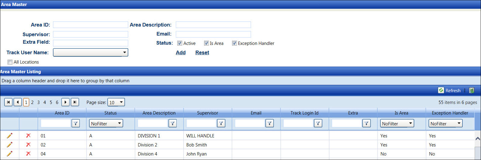 From the Area Master Listing, click the Edit icon on a line item to display its information in the appropriate text boxes, drop-down list, and status checkboxes.