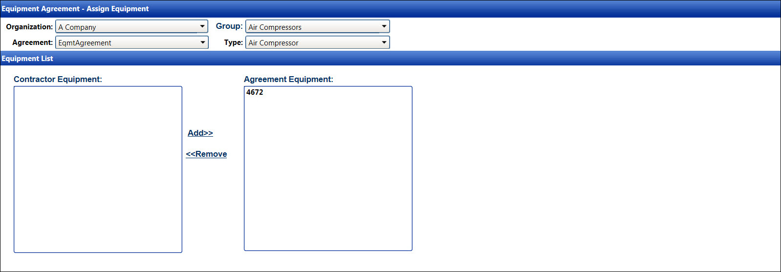 Select an equipment type for the Type drop-down list to display the assigned equipment in Agreement Equipment list box.