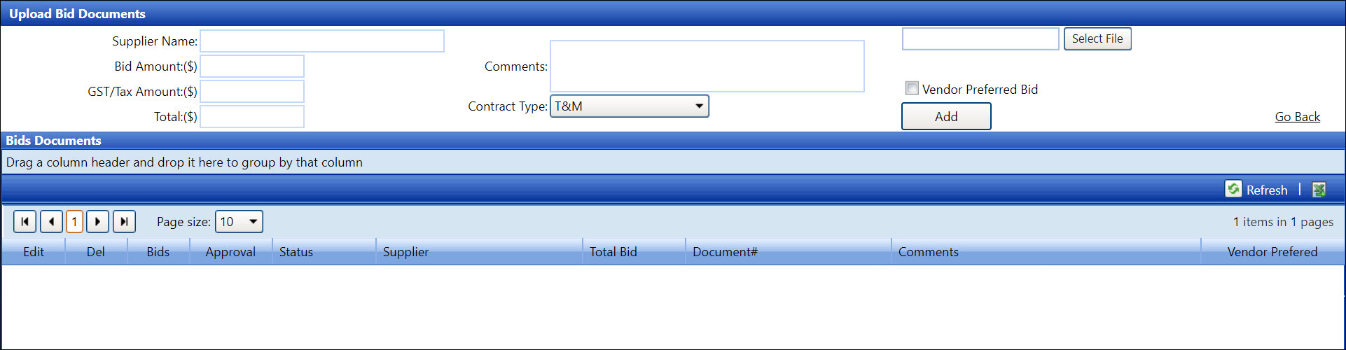 Users will have access to the bid documents feature according to the assigned profile rules. From the Upload Bid Documents screen, click the Go Back link to return to previous page.