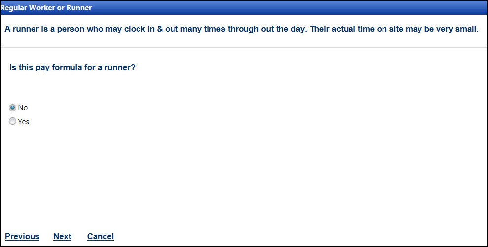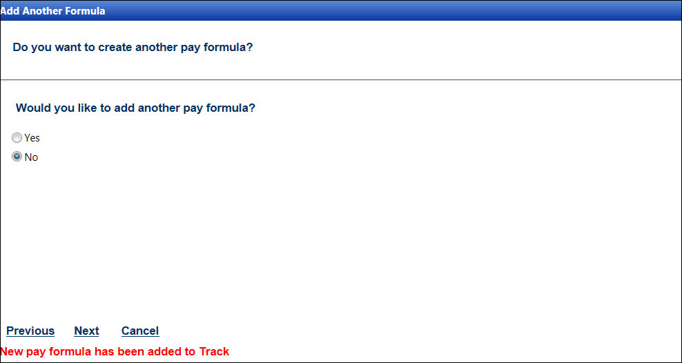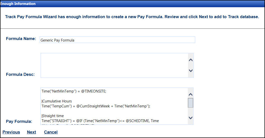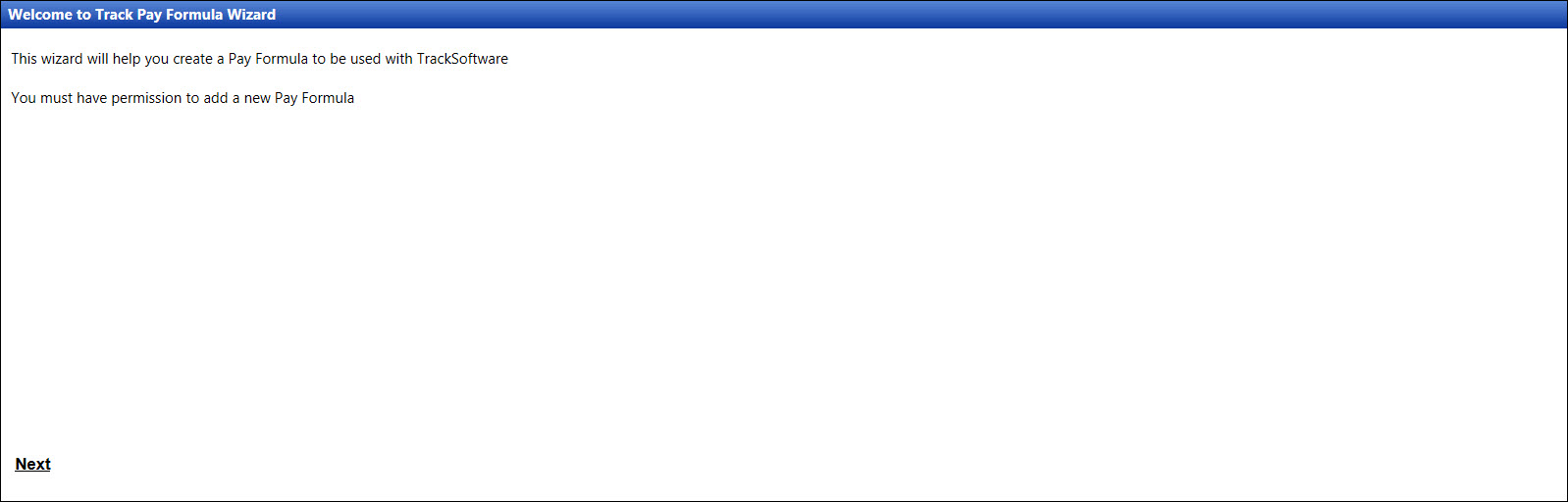 From the Welcome to Track Pay Formula Wizard screen, click Next to display the New Pay Formula screen.