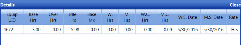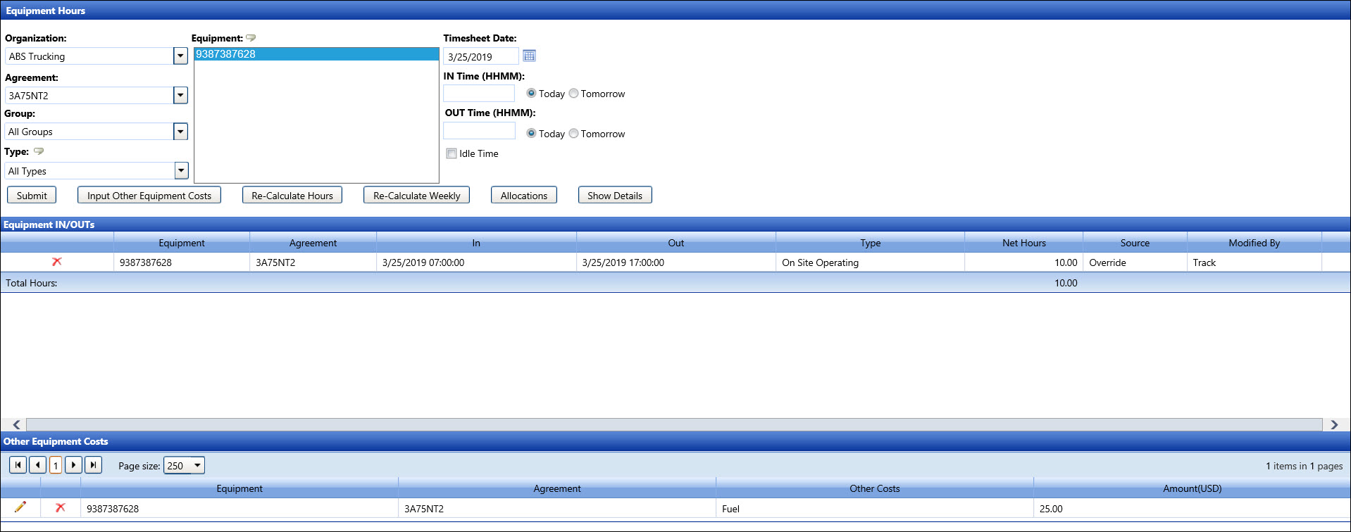 The hours for equipment are manually entered in the Equipment Hours screen. Equipment hours may be entered as idle hours since equipment can have an idle rate if stated in the agreement with the contractors. Depending on the agreement, there is an option to enter other equipment costs.