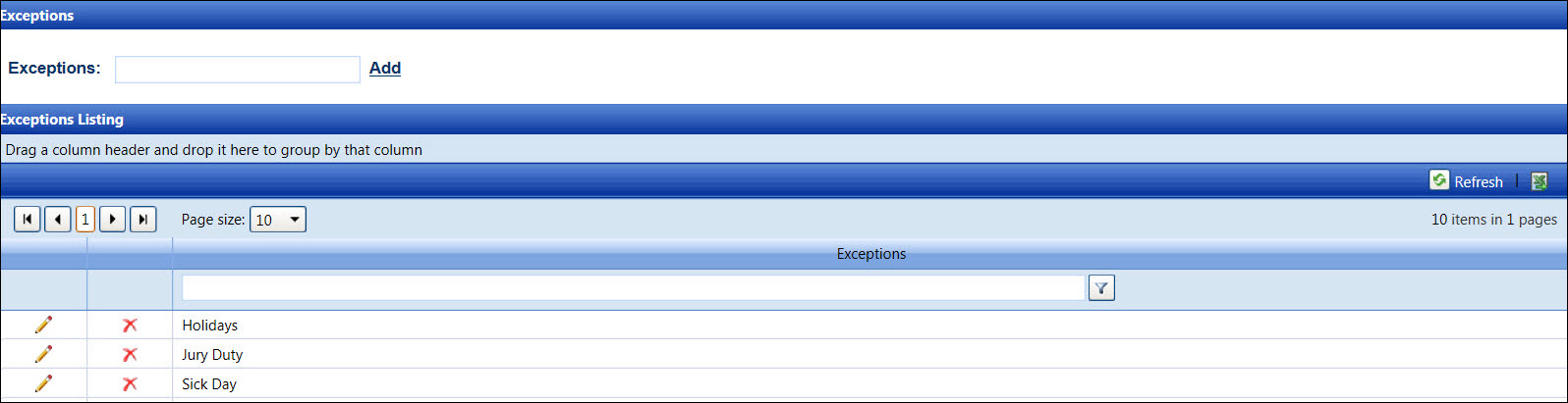 From the Exceptions screen, enter a new exception name into the Exceptions text box.
