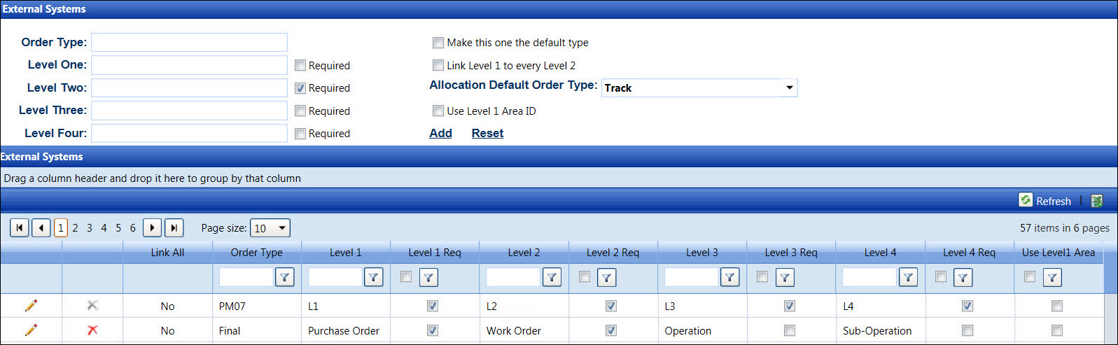 Work order structures are setup and defined in the External Systems screen. Each level name, Order Type, Level 1, Level 2, Level 3, or Level 4 can be customized according to the company’s standards. Level names are set up to match vendor invoice, project definitions, or other criteria.
