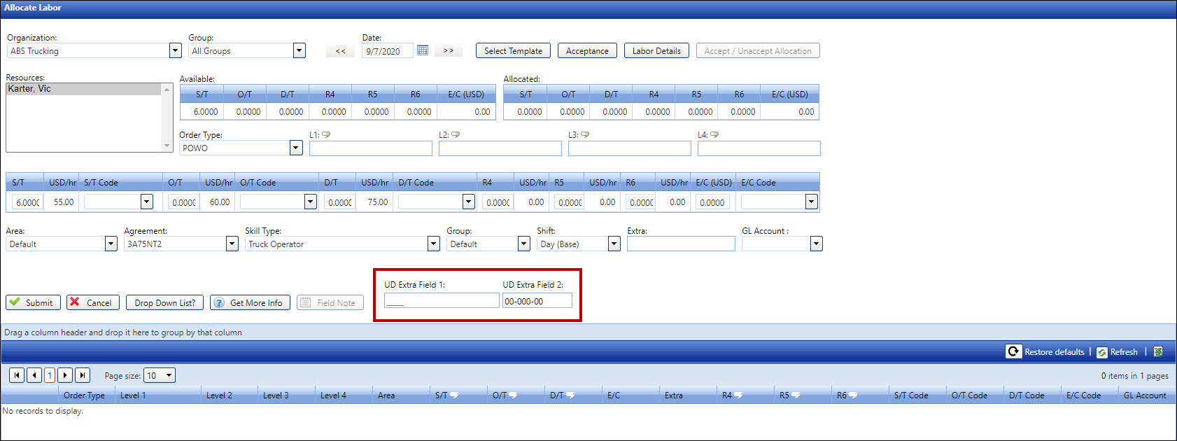 the Allocate Labor screen, the Extra Fields are displayed with the