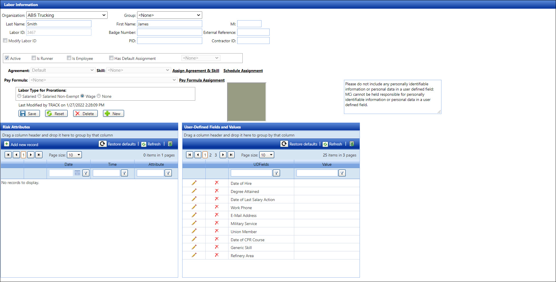 Click the Save button to save the new labor resource information and display the Risk Attributes and User-Defined Fields and Values grids. Refer to Risk Attribute and User-Defined Information to add or edit the information.