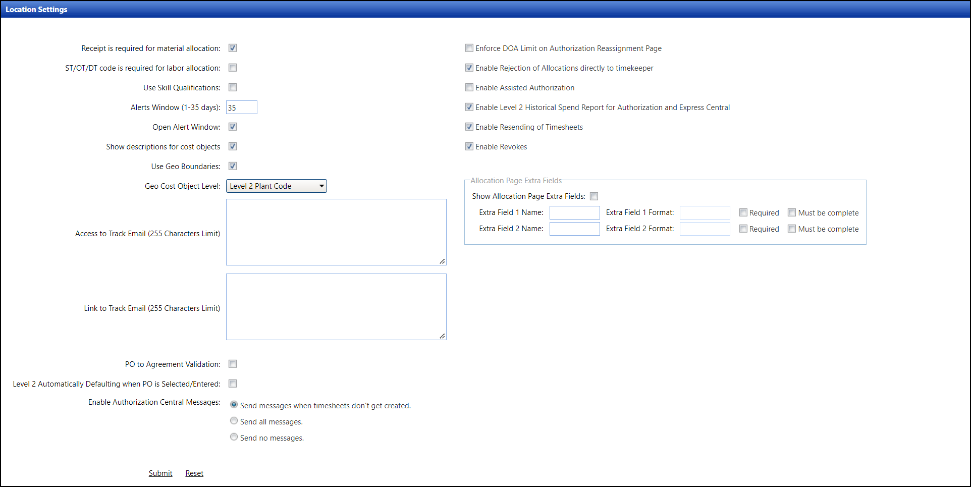 The Show Allocation Page Extra Fields setting enables two additional extra fields for the labor allocations, allowing up to 15 alphanumeric characters per text box. The additional extra fields are able be configured to meet the organization's business needs. If the Show Allocation Page Extra Fields setting is enabled, the users must enter one of the extra field names with the character format. Refer to Extra Fields for the Allocation Screens for the screens that will display the user-defined Extra Fields if the setting is enabled.
