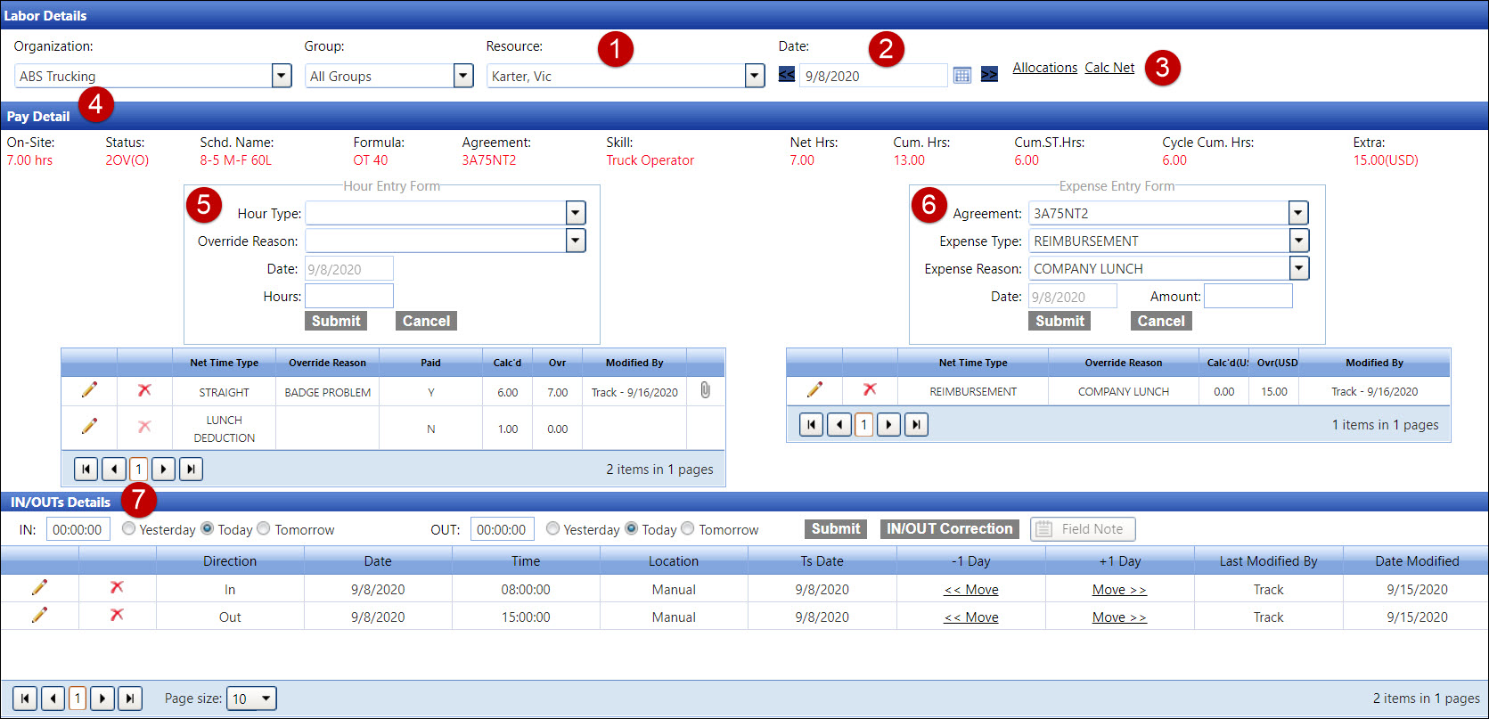 The overrides are completed in the Labor Details screen. If the labor resource has a pay formula that is calculating overtime based on the cumulative hours for the week, remember to recalculate all the time for the rest of the week after adding an hour override. For example, during the day on Thursday, an override is performed for Monday's hours. The hours that were calculated on Tuesday and Wednesday were based on the original calculation of Monday hours, not the hours after the override. Correct the cumulative hours for the week by recalculating Tuesday and Wednesday's hours. When the labor badges out on Thursday, then the calculation for the week will automatically be corrected.
