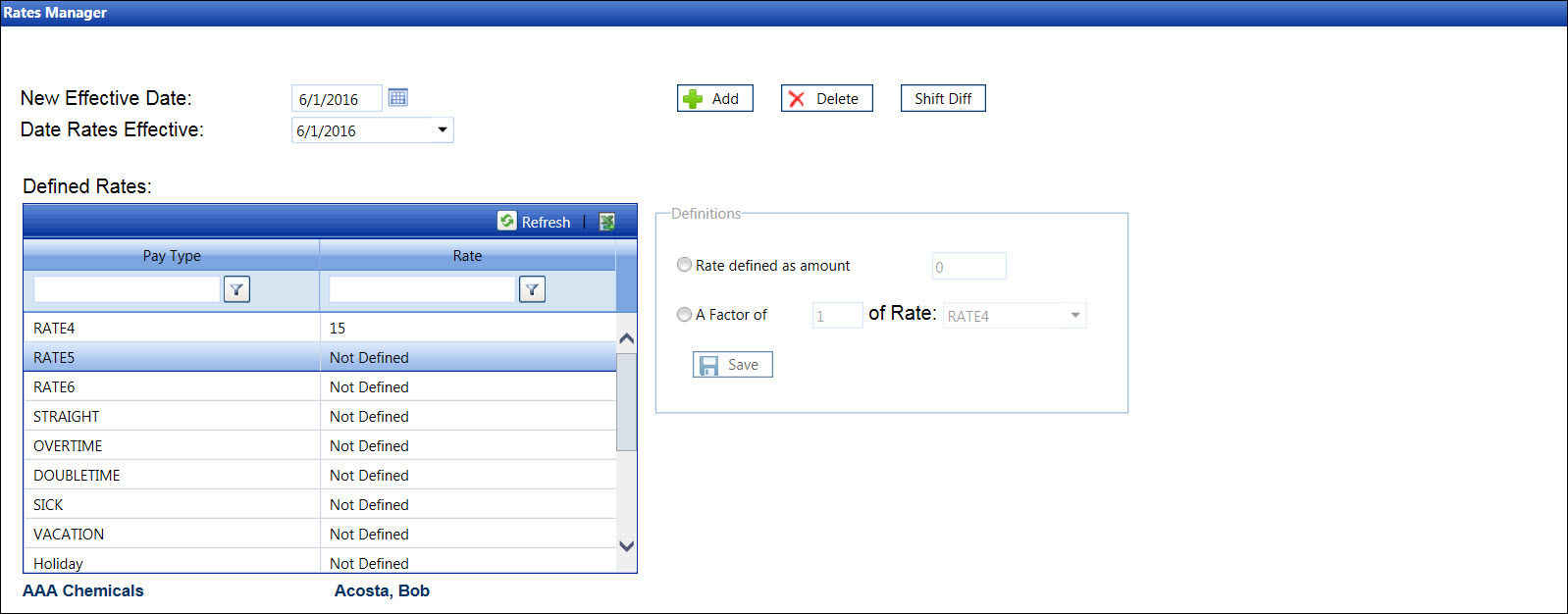 Click the Save button to save the defined pay rate. "Factor" is displayed under the Defined Rates grid's Rate column.