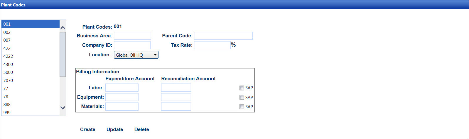 From the Plant Codes screen, click Create to enable the text boxes.