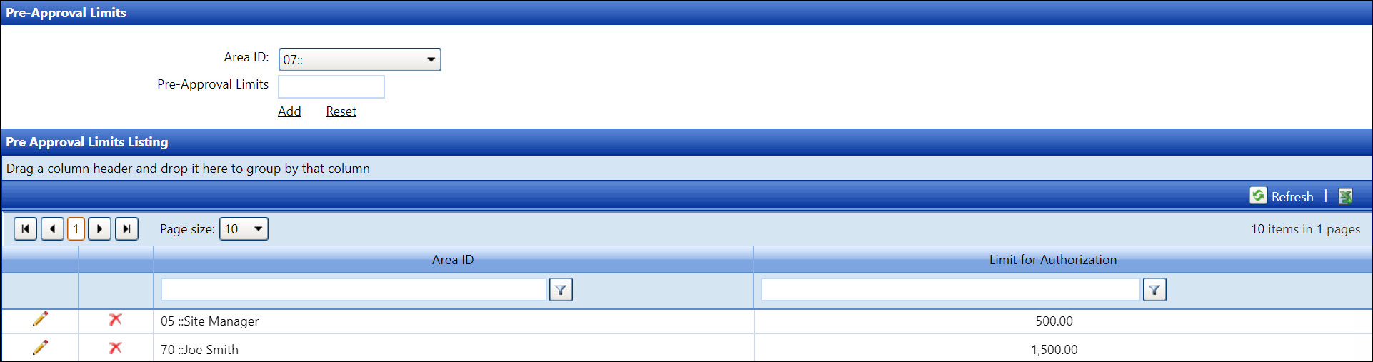 From the Pre-Approval Limits screen, select an area ID from the Area ID drop-down list.