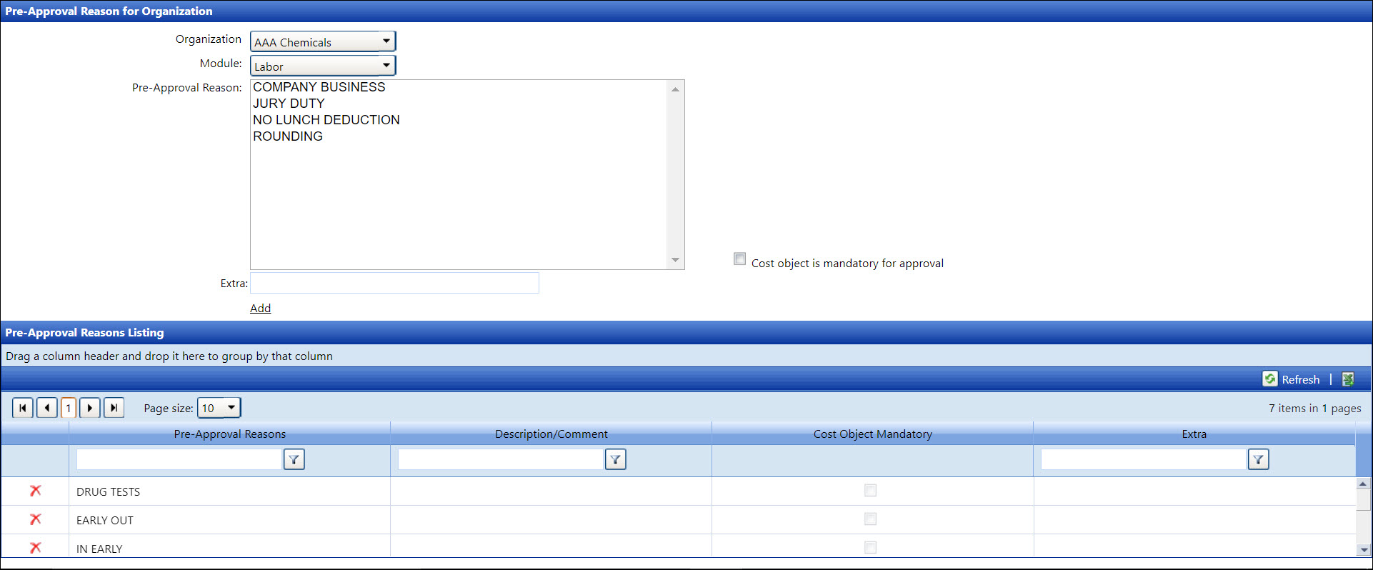 Click the Add link to assign the selected pre-approval reasons to the selected organization and module, displaying them in the Pre-Approval Reasons Listing.