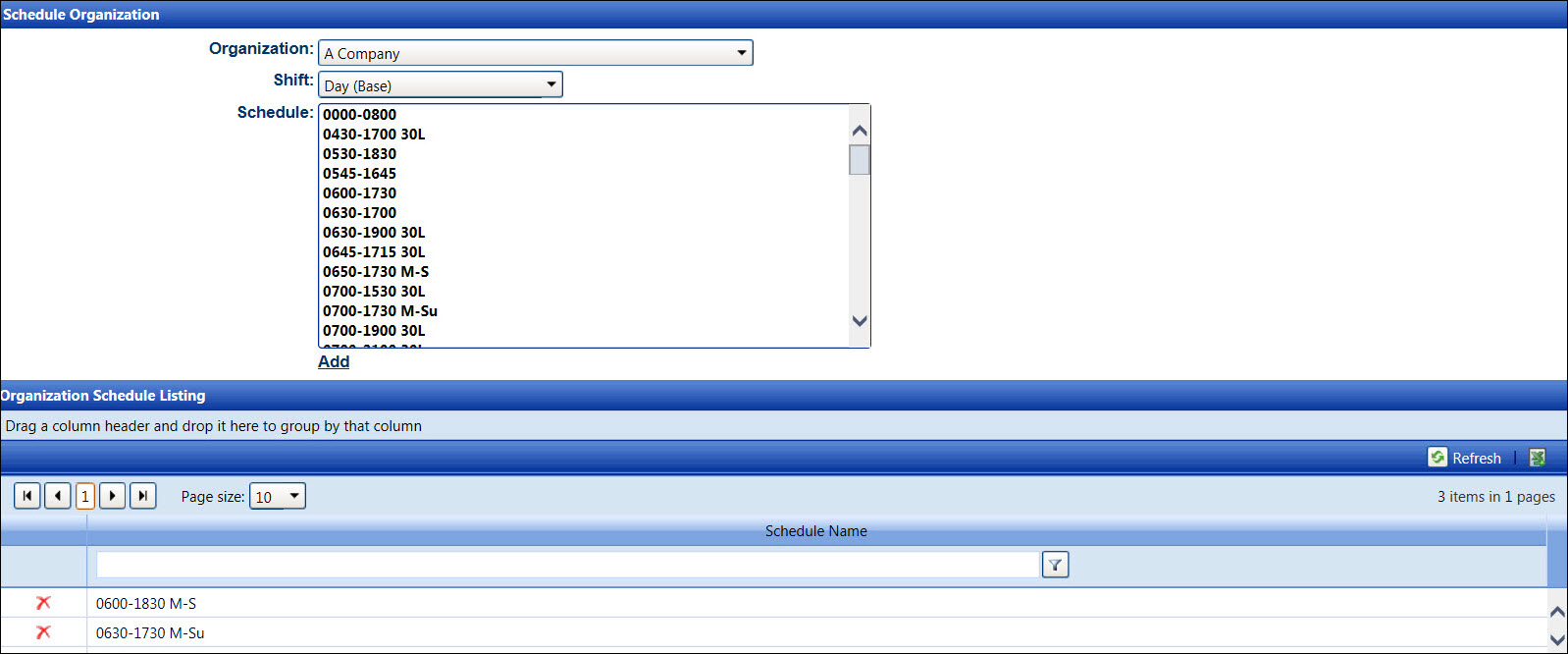 Click Add to assign the highlighted schedules to the selected organization and display them in the Organization Schedule Listing.