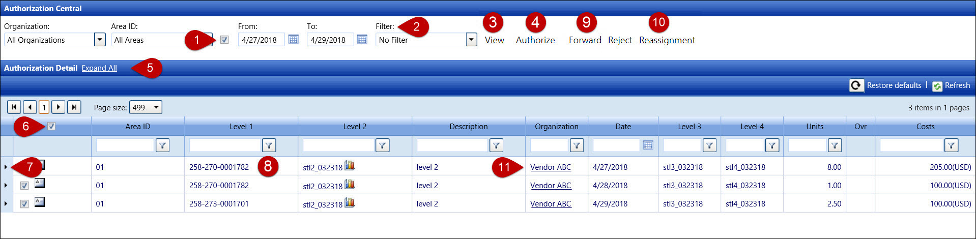 Click the Filter drop-down list and select Labor, Equipment, or Material option to display specific records in the Authorization Detail grid.