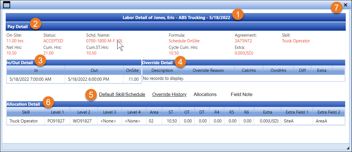 The Override Detail grid displays the override information. Refer to Override Labor Hours and Extra Charges for more information.