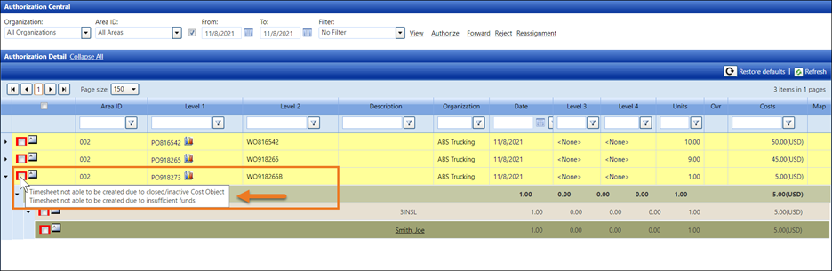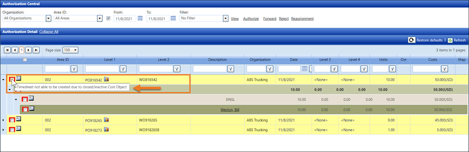 When the Enable authorization blocking for inactive Cost Objects option is enabled, and the cost objects have expired and/or are inactive, the red box will be displayed around the checkboxes at the Authorization Central screen for Authorization Central and Express Central. Hovering a mouse pointer over the checkbox at the Cost Object level will display the message, "Timesheet not able to be created due to closed/inactive Cost Object." These allocations pending authorizations line items will also display in yellow.